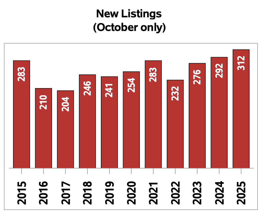 The number of new listings was up by 6.8% from October 2024. There were 312 new residential listings in October 2025. This was also the largest number of new listings added in the month of October in history.