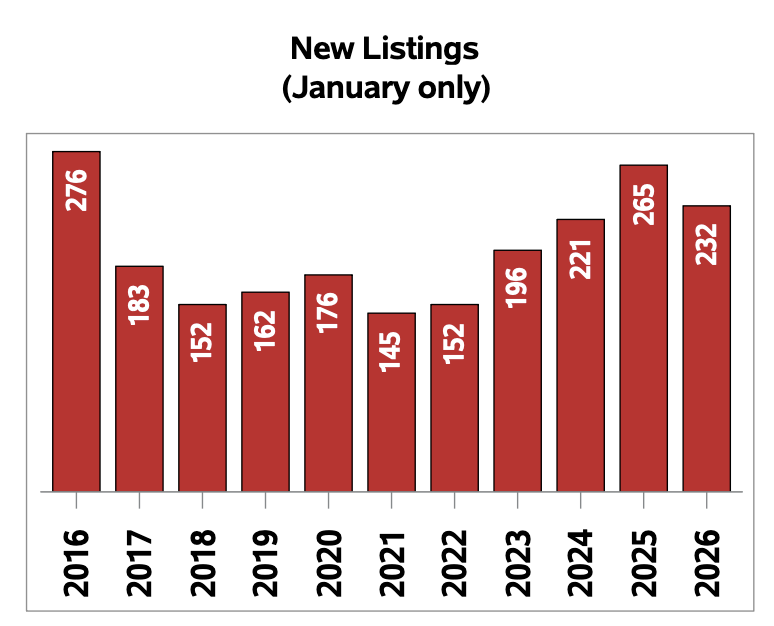The number of new listings saw a decrease of 12.5% from January 2025. There were 232 new residential listings last month.