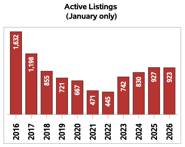 Active residential listings numbered 923 units on the market at the end of January, nearly unchanged, down only 0.4% (four listings) from the same time last year.