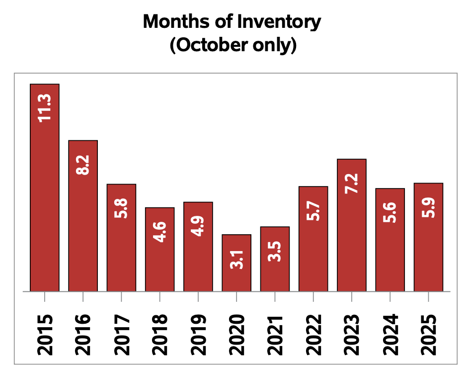 Months of inventory numbered 5.9 at the end of October 2025, up from the 5.6 months recorded at the end of October 2024 and above the long-run average of 5.5 months for this time of year. The number of months of inventory is the number of months it would take to sell current inventories at the current rate of sales activity.