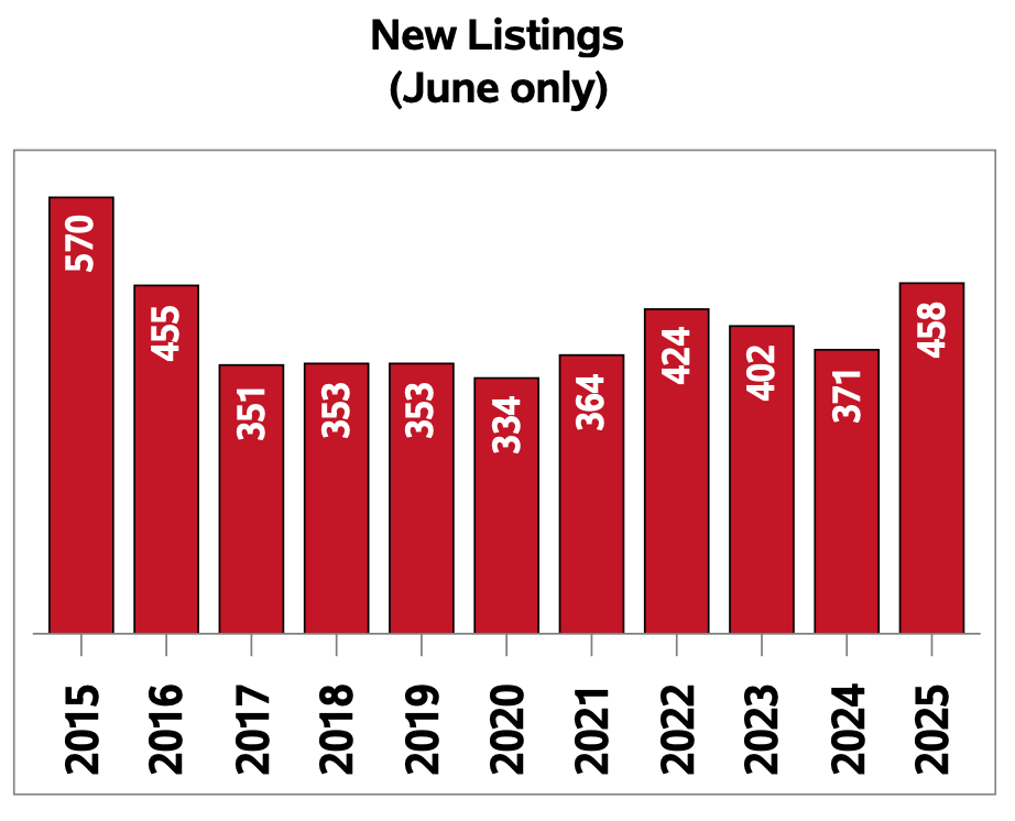 The number of new listings saw a gain of 23.5% from June 2024. There were 458 new residential listings last month. This was the largest number of new listings added in the month of June in a decade.