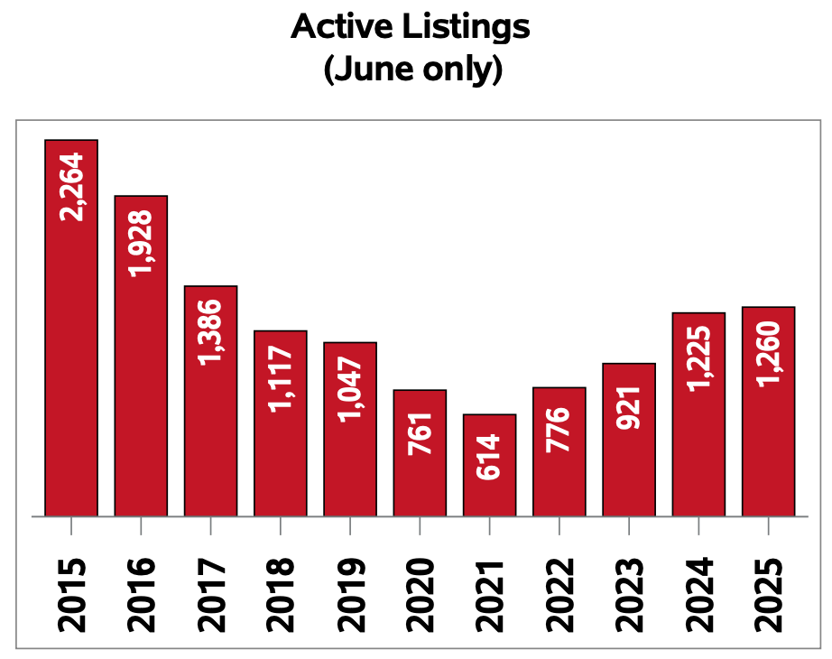 Active residential listings numbered 1,260 units on the market at the end of June, up modestly by 2.9% from the end of June 2024. Active listings haven't been this high in the month of June since before COVID times. However they are still quite stable overall, there isn’t a massive surplus inventory like a decade ago.