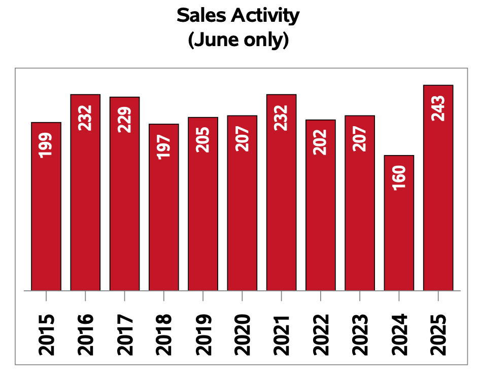 Homes sold totalled 243 units in June 2025. This was an advance of 51.9% from June 2024. This was also a new sales record for the month!
